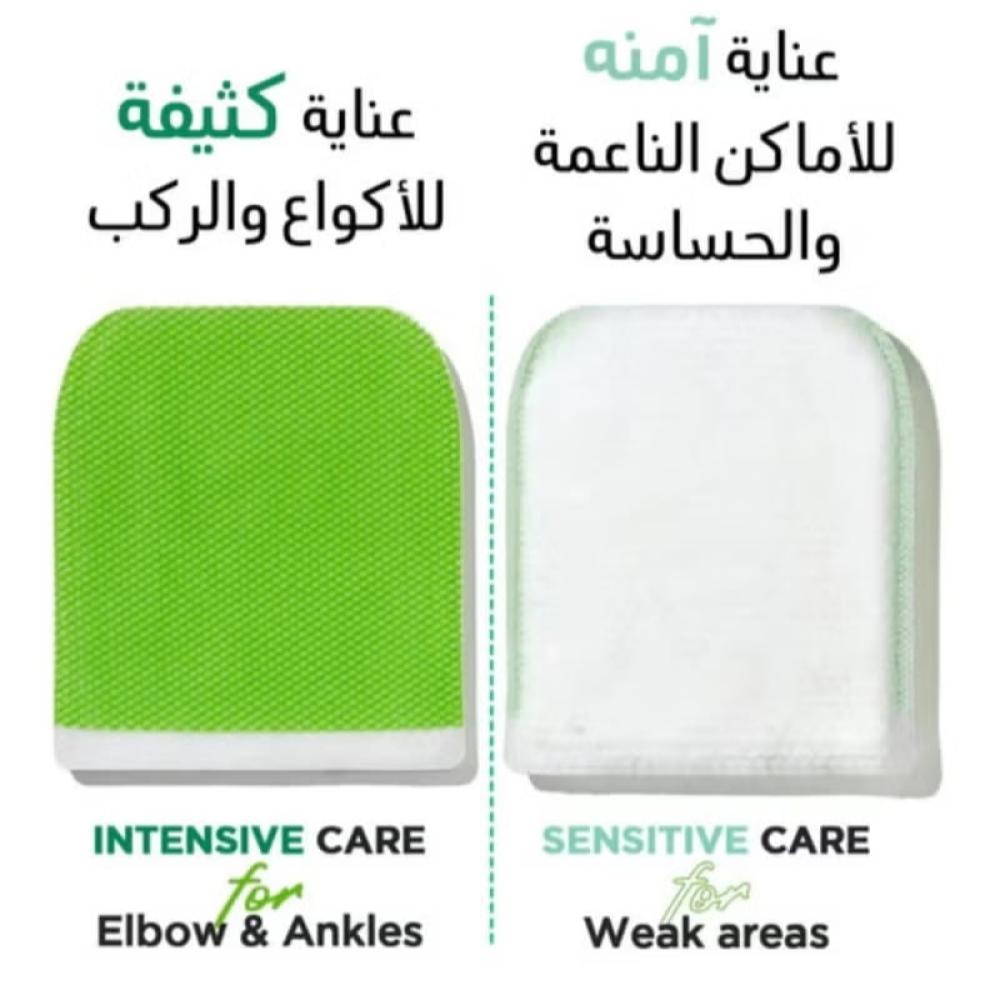 انتقل إلى الجانب الأحمر لفرك المناطق التي تتراكم فيها خلايا الجلد الميتة، مثل المرفقين والكاحلين.